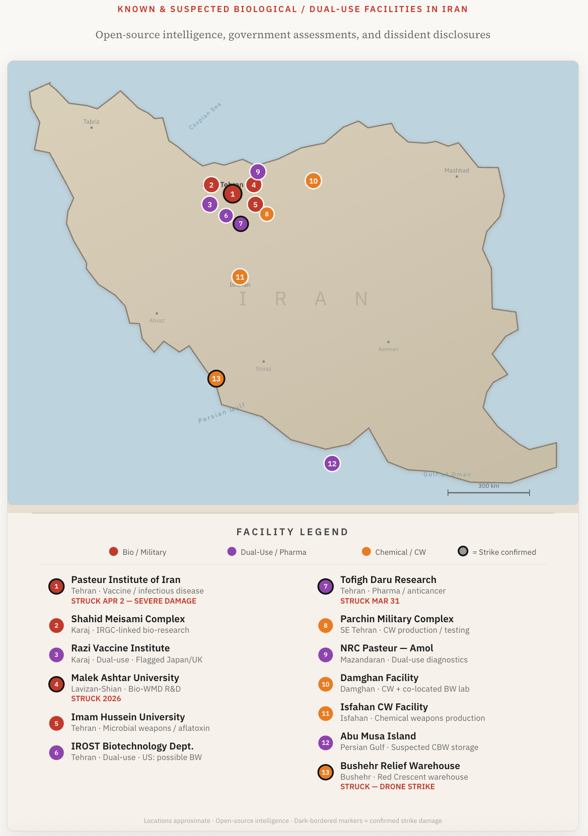 The Bulletin of the Atomic Scientists confirmed that the Shahid Meisami Research Complex, Imam Hussein University, and Malek Ashtar University have all sustained strike damage across the 2025 and 2026 campaigns. The Pasteur Institute — Iran’s century-old vaccine and infectious disease center, but also flagged by Japan and Britain as a biological weapons proliferation concern — was severely damaged on April 2.