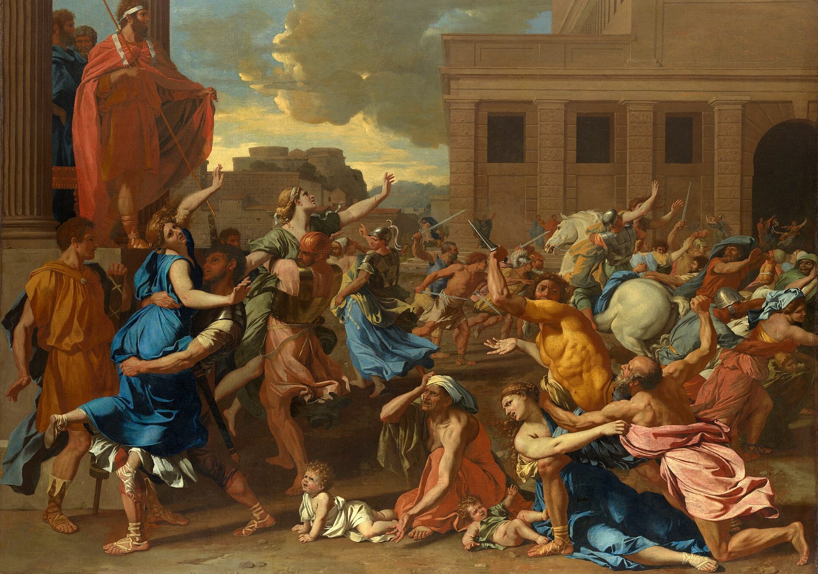 Indeed, the so-called “Rape of the Sabine Women” is a foundational myth of ancient Rome that tells of first-generation Roman men, under Romulus, abducting young women from neighboring Sabine families to take as wives. In this context, the word "rape" derives from the Latin raptio, meaning mass kidnapping or abduction. The myth has been depicted in multiple paintings, including the following by Nicolas Poussin.