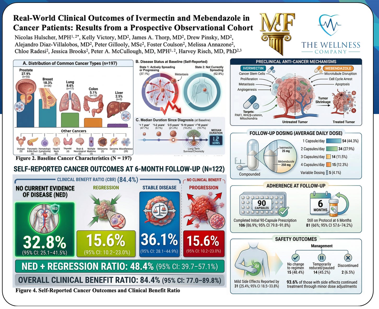 Overall, the ivermectin–mebendazole combination illustrates how repurposed drugs may target multiple cancer vulnerabilities simultaneously, and explains why it is biologically plausible that 84% of patients in the recent study from The Wellness Company had net clinical benefit.