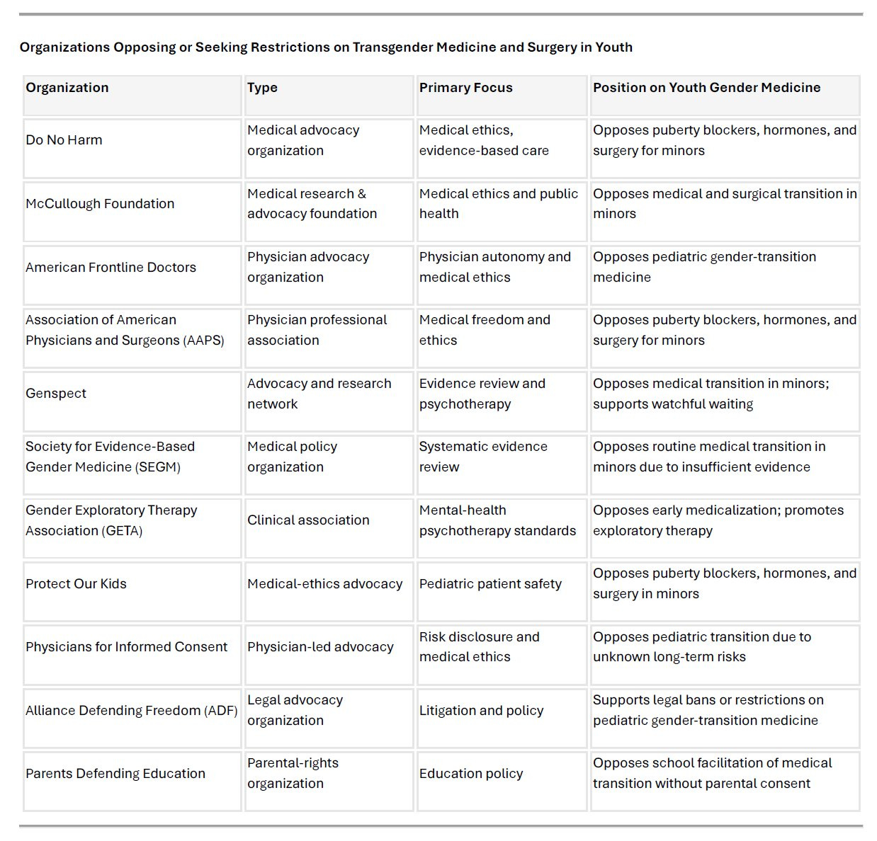 It is also important to note that opposition to pediatric medical transition did not begin this week. In addition to the McCullough Foundation, over a dozen medical, research, and advocacy organizations have expressed serious concerns from the outset — citing insufficient long-term data, evolving neurodevelopment in adolescents, and the ethics of irreversible intervention: