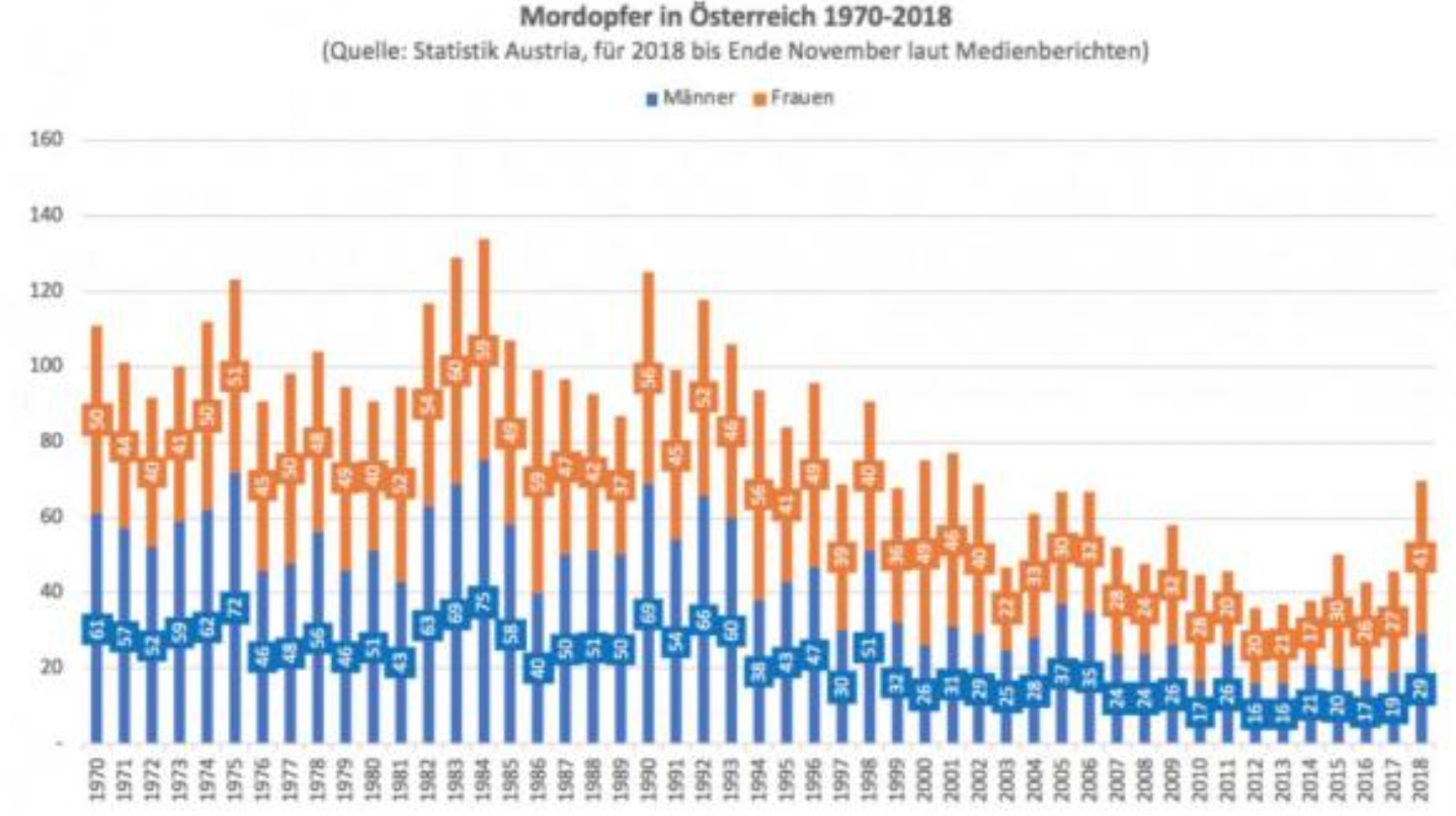 I then found the following graph of murders in Austria during the forty-eight years between 1970-2018. The 2000s, when I lived in Vienna, was an especially happy time, with less than 30 murders per year in the entire country.