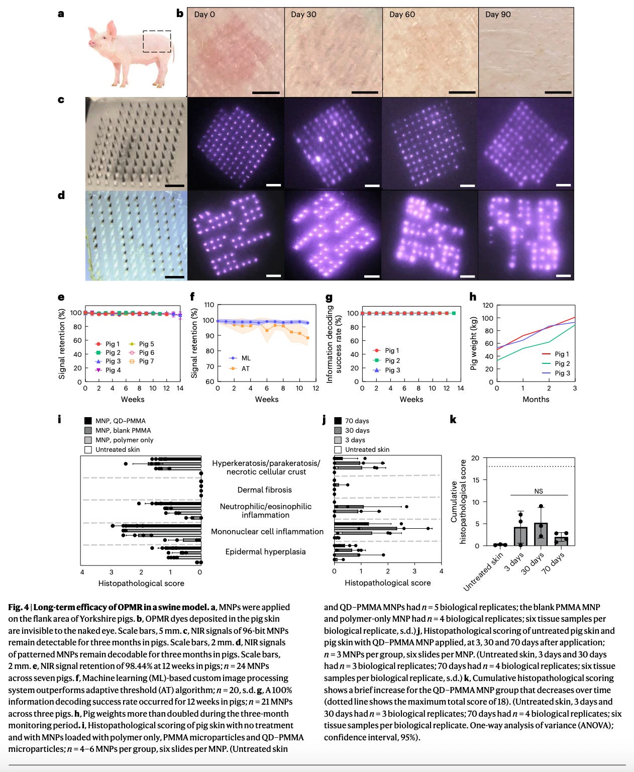 Quantum-dot microparticles, which embed a binary pattern of medical data into the dermis for long-term storage ( signal retention ~98 % for three months in pig models ).