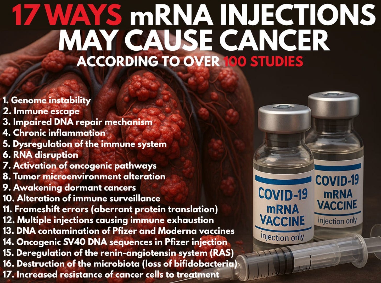At the same time, a growing body of mechanistic literature—now exceeding 100 studies—has identified at least 17 biological pathways through which mRNA technology may induce, accelerate, or reactivate cancer.