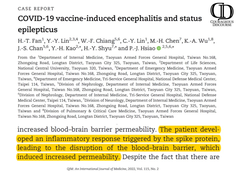 [i] Fan HT, Lin YY, Chiang WF, Lin CY, Chen MH, Wu KA, Chan JS, Kao YH, Shyu HY, Hsiao PJ. COVID-19 vaccine-induced encephalitis and status epilepticus. QJM. 2022 Feb 21;115(2):91-93. doi: 10.1093/qjmed/hcab335. PMID: 34978572; PMCID: PMC9383153.