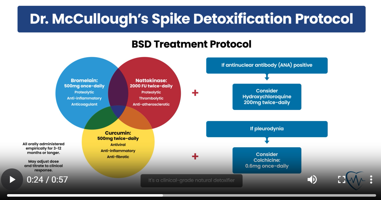 The discussion turns to vaccine shedding—the possibility that vaccinated individuals may transmit spike proteins to others. McCullough notes that blood testing for anti-spike antibodies can reveal unusually high levels (thousands of binding units per milliliter) in some people who never received injections, suggesting environmental or interpersonal exposure. He describes the spike protein as biologically active and pathogenic, linked to inflammation, clotting, and neurological symptoms. To combat this, McCullough outlines his “McCullough Protocol Base Spike Detoxification” regimen composed of nattokinase, bromelain, and curcumin, sold by the Wellness Company. He claims these components are scientifically supported for helping the body clear spike protein and encourages widespread use for both vaccinated and infected individuals.