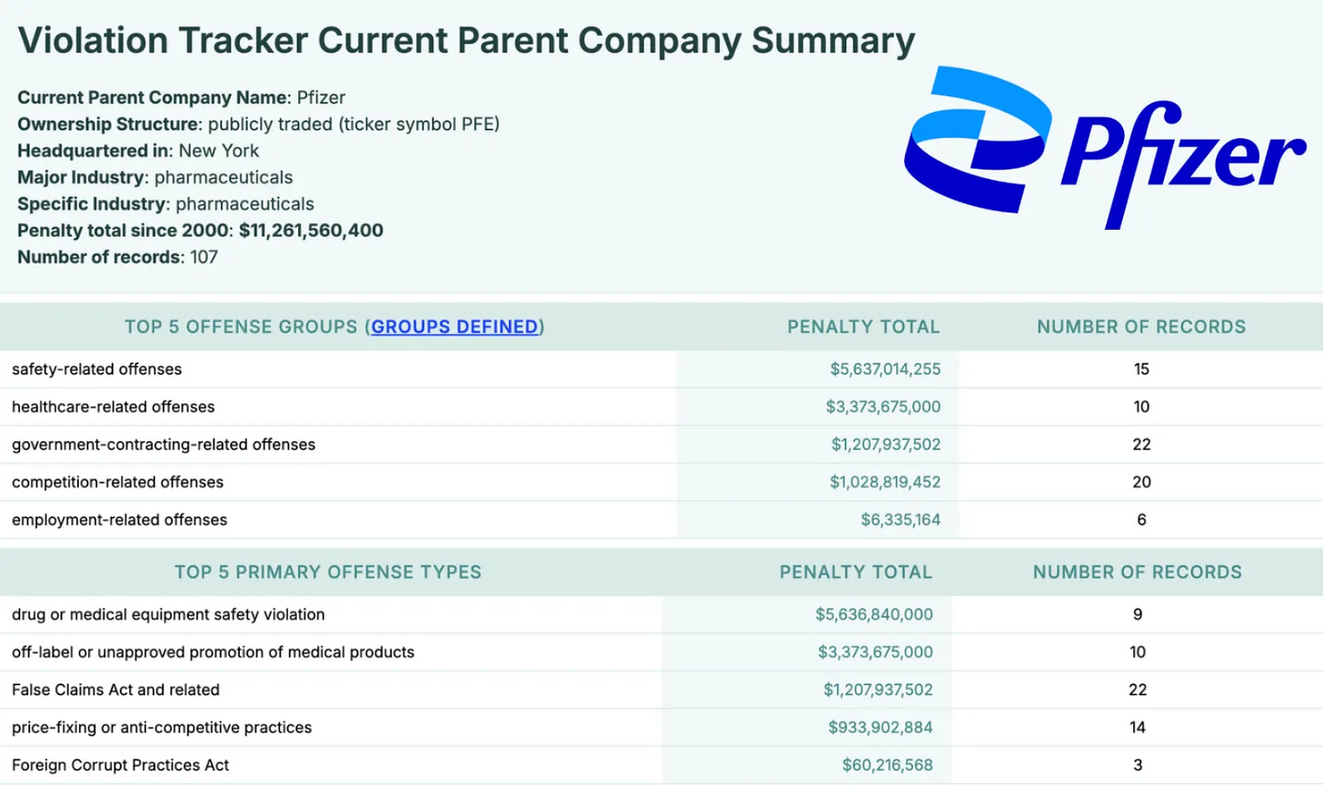 According to Violation Tracker, Pfizer’s penalties since 2000 total more than $11 billion across criminal, civil, and regulatory cases — a staggering figure that exposes a pattern of lawlessness, not isolated mistakes.