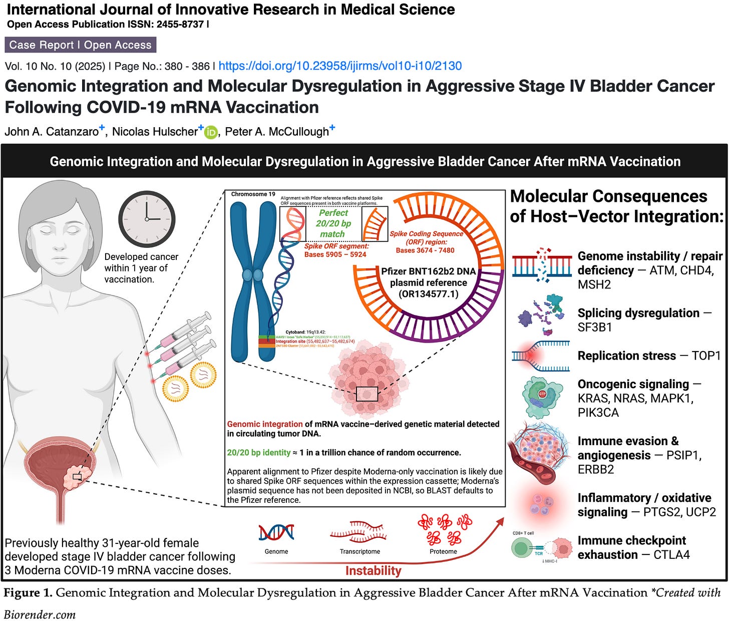 We also discussed our peer-reviewed discovery of vaccine-derived genetic material integrated into human chromosome 19 in a woman who developed stage IV bladder cancer shortly following 3 mRNA shots — representing the first documented evidence of genomic integration in humans.