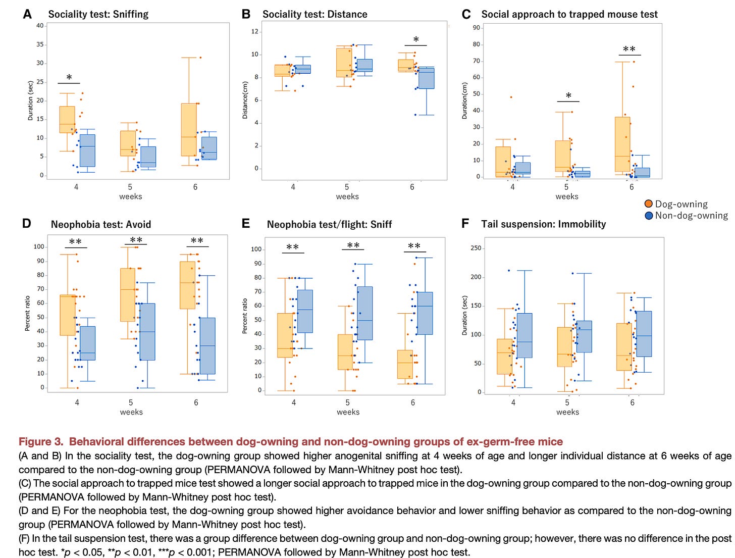 Mice colonized with microbiota from dog-owning adolescents showed significantly greater social approach behaviors, including increased engagement with trapped conspecifics — a well-established proxy for pro-social or empathy-like behavior in rodents.