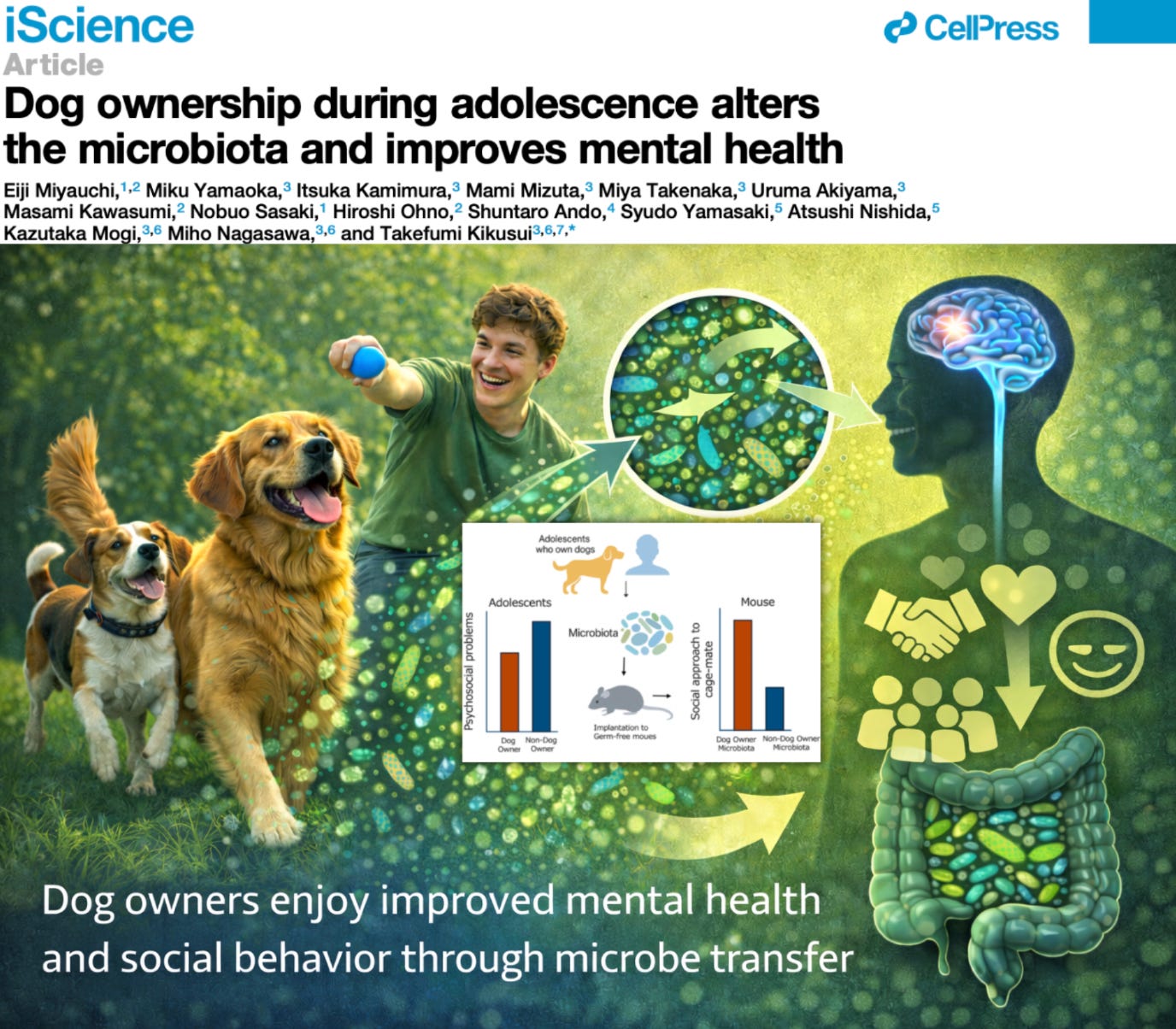 Using longitudinal data from a population-based cohort of 345 adolescents, combined with microbiome sequencing and germ-free mouse transplantation experiments, researchers demonstrated that dog ownership during adolescence alters the human microbiome in ways that measurably improve social behavior.