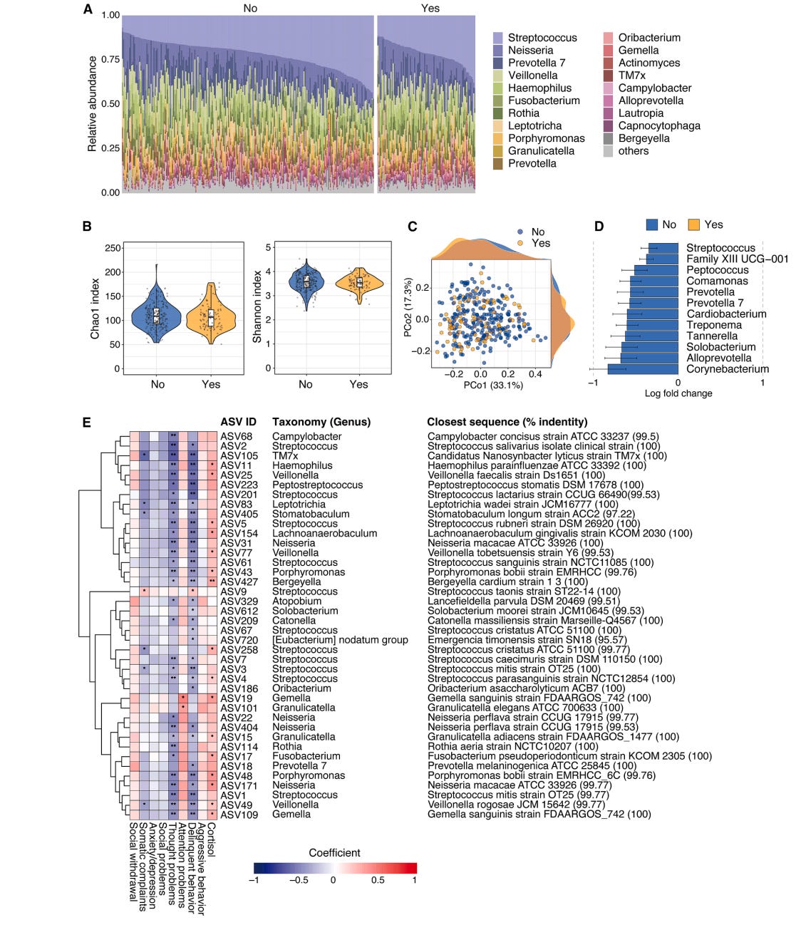 When researchers analyzed the adolescents’ oral microbiomes, they did not find broad differences in overall diversity. Instead, the signal emerged at strain-level resolution. Adolescents who lived with dogs harbored higher abundances of specific bacterial variants, particularly distinct Streptococcus amplicon sequence variants (ASVs).