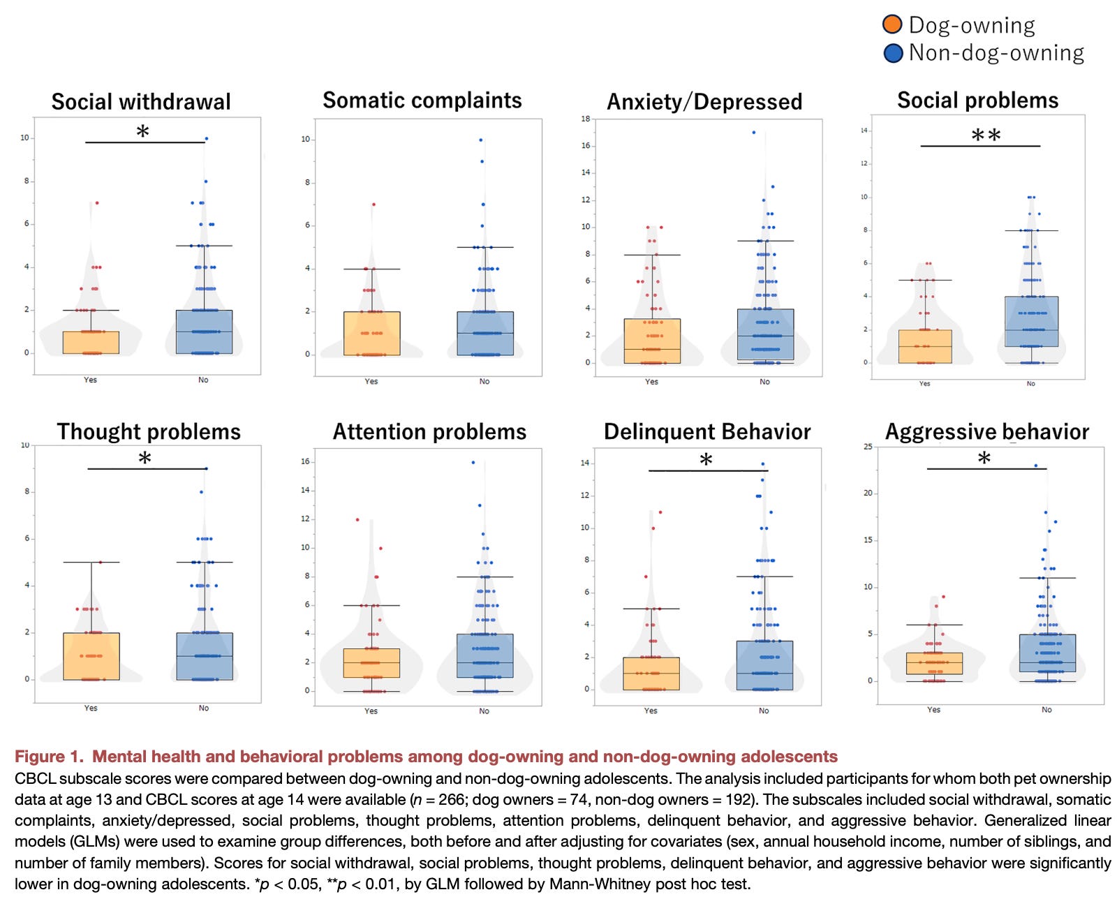 Across the cohort, adolescents who owned dogs showed consistently lower scores for mental and behavioral problems, particularly in domains related to social functioning. Compared with non-dog-owning peers, they exhibited significantly fewer social problems, less social withdrawal, fewer thought problems, lower delinquent behavior, and reduced aggression.