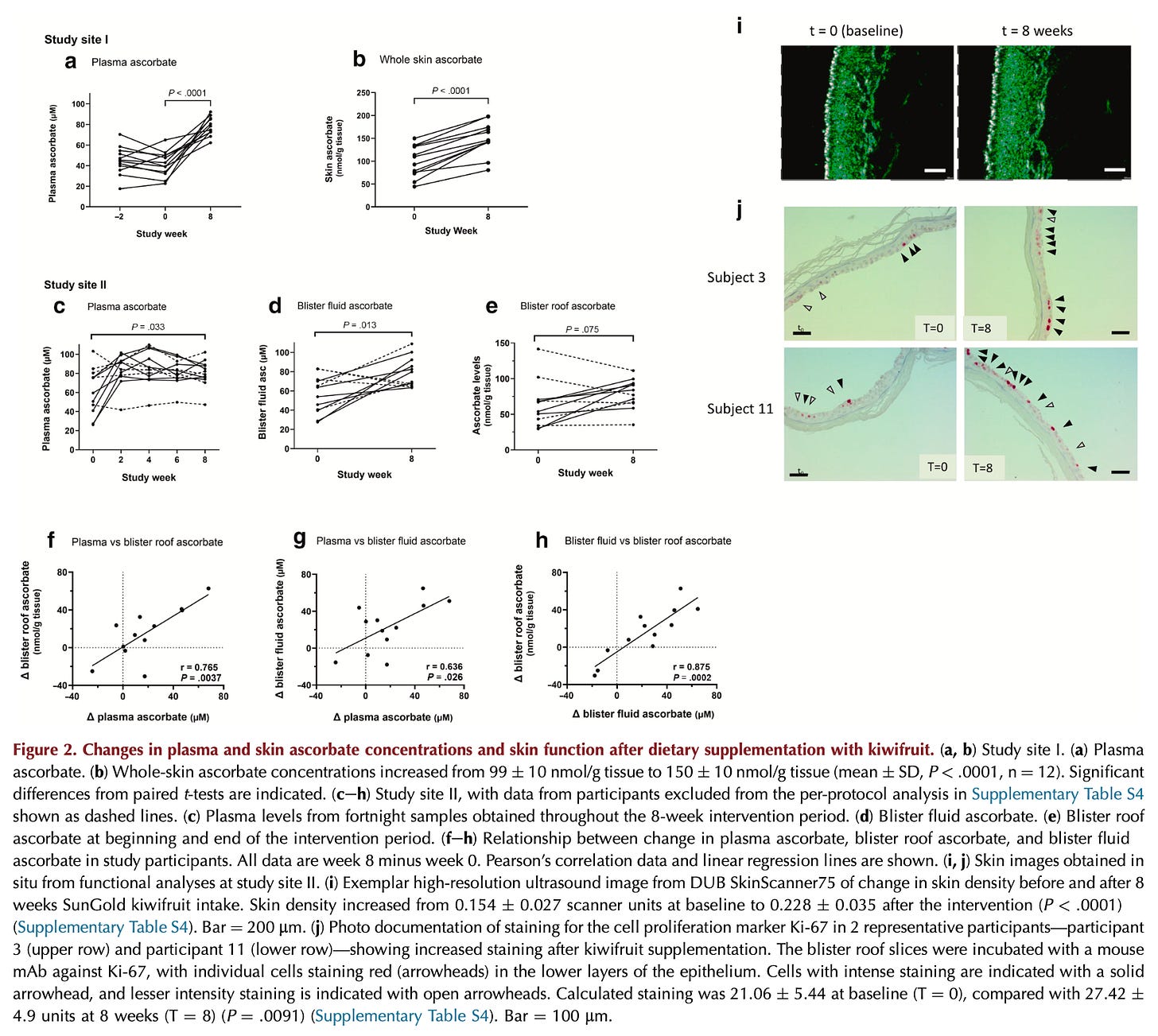 At the intervention site where both blood and skin-related sampling were done (full cohort, n=12), the results showed clear rises after 8 weeks of two kiwifruit per day: