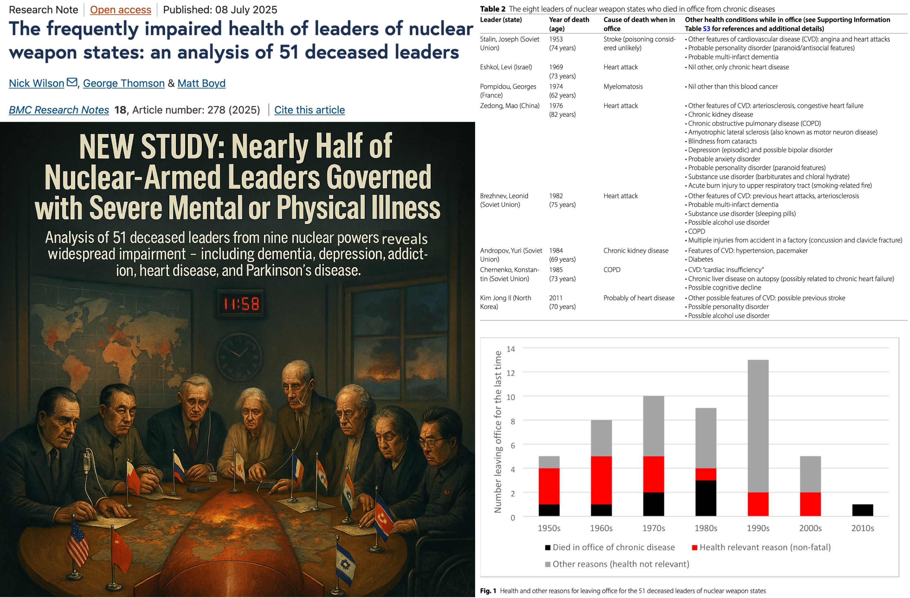 A new peer‑reviewed study titled, The frequently impaired health of leaders of nuclear weapon states: an analysis of 51 deceased leaders, has revealed a chilling truth: 45% of past leaders of nuclear‑armed nations since the dawn of the atomic age had health conditions that could impair judgment — some while holding sole authority to launch nuclear weapons.