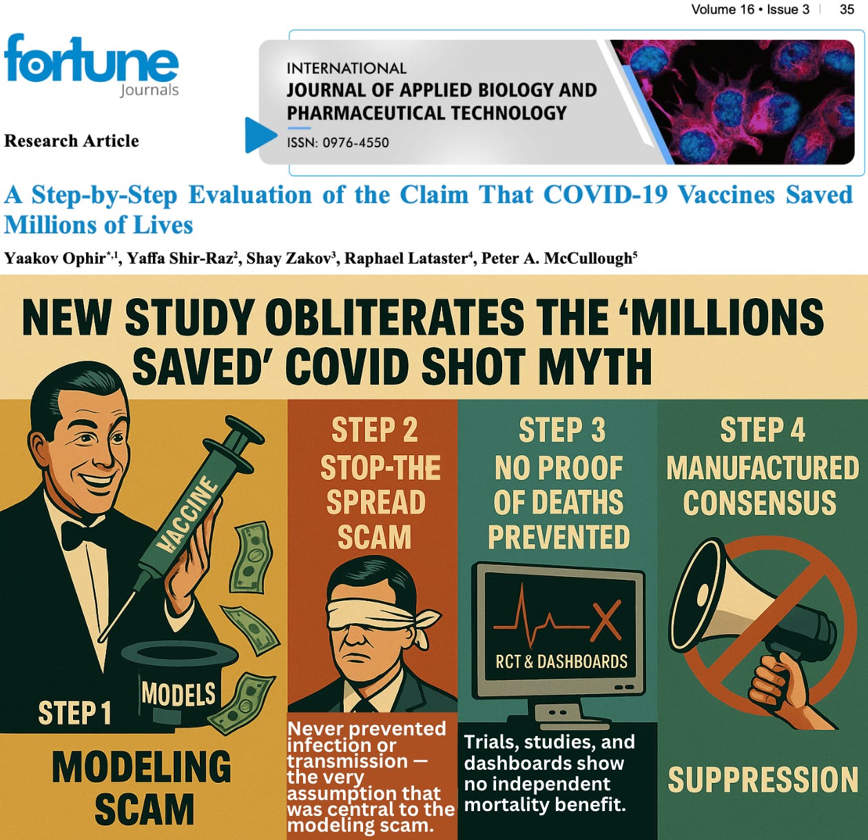 No longer able to deny harms, they resort to a new defense: the fraudulent claim that COVID shots “saved millions of lives.” This talking point is designed to override evidence and silence accountability. But it collapses under scrutiny. A new peer-reviewed paper, A Step-by-Step Evaluation of the Claim that COVID-19 Vaccines Saved Millions of Lives, shows in detail why this claim is scientifically baseless and manufactured through deception: