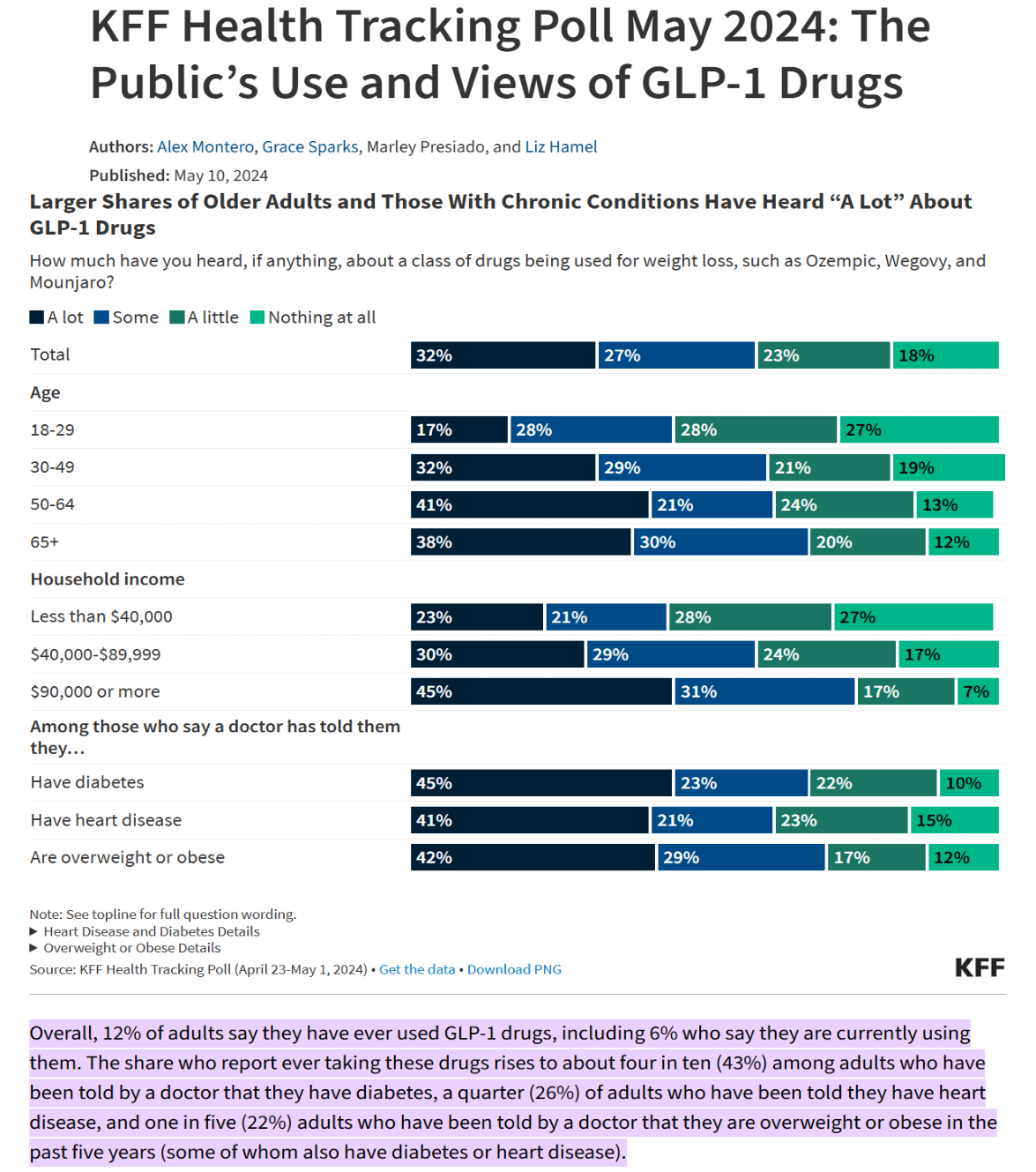 Approximately 12% of U.S. adults have used GLP-1 drugs at some point in their lives, with about 6% of adults currently taking them. Use has been rapidly increasing, especially among those using the medication for weight loss.