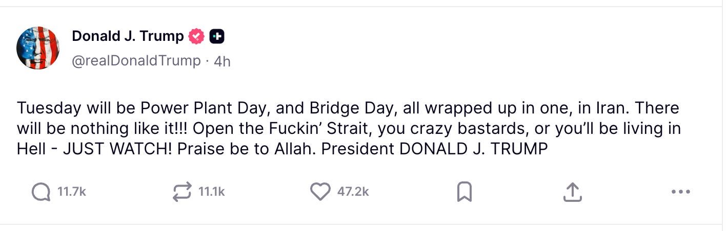 I voted for Trump and I don't support this attack on Iran. This is not liberating anybody, it is threatening overwhelming genocide. It is war crimes to eviscerate a country's bridges and power plants. To write this tweet on Easter Sunday in America while Americans are suffering is insulting and frankly alarming. We voted for domestic help: lower taxes, prices, building infrastructure, bringing abundance back to America. We can't afford out lives here. We can't afford WWIII