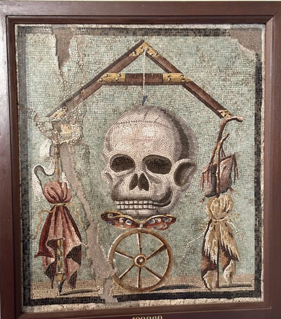 As unpleasant as the experience was, I believe it’s a very valuable thing to be occasionally reminded—in a stark way—of one’s vulnerability and mortality. The ancient Stoics had a habit of contemplating their mortality every day—not to be morbid, but to keep their minds focused on what is meaningful and to avoid wasting time on trivialities, needless conflicts, and needless drama. Many possessed artistic symbols of death such as figurines of skulls. One of the mosaics that was excavated at Pompeii is an elaborate Memento Mori.