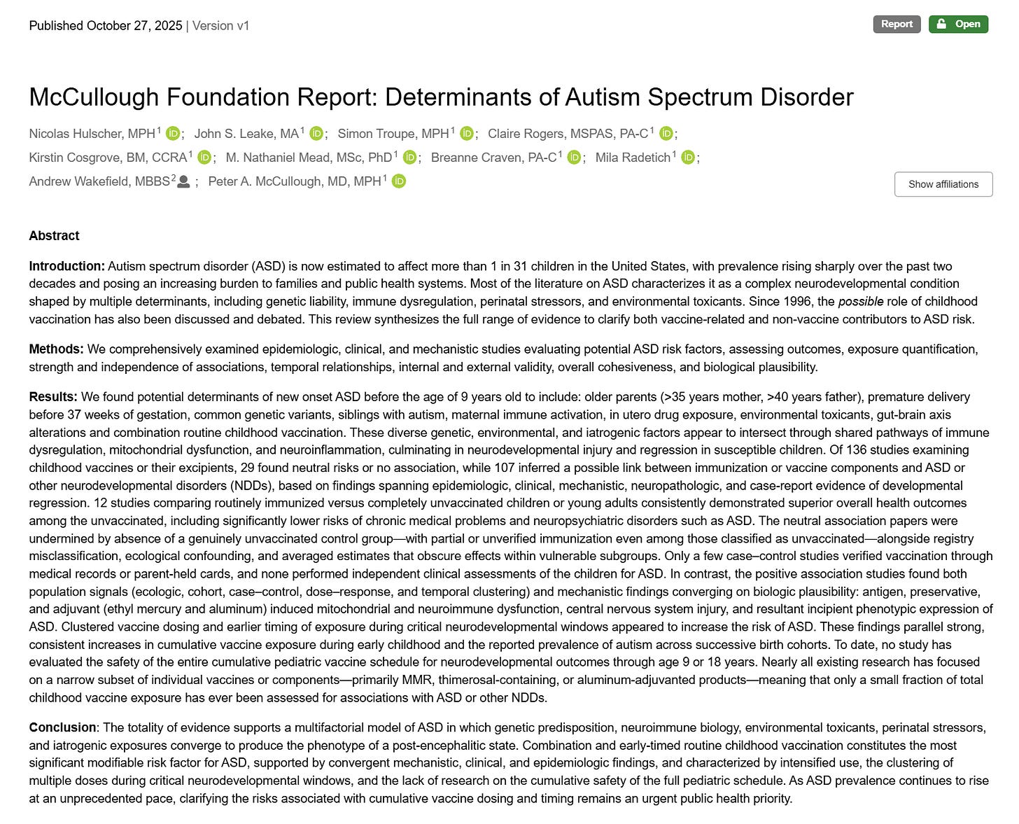 I reminded the broadcast team on Live from Studio 6B on Real America’s Voice that Robert F. Kennedy, Jr emphasized on the September 22, 2025 press briefing that 40-70% of parents with autistic children believe the affliction was linked to routine childhood vaccination. Based upon the McCullough Foundation Report on The Determinants of Autism, parents were right.