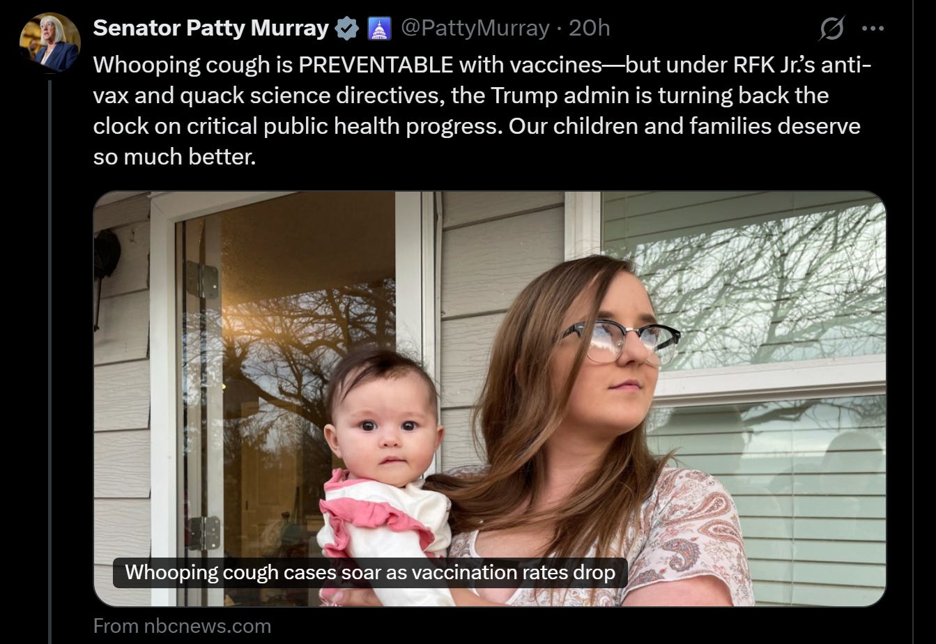 The vaccine debate is heating up with fear-driven politically charged comments coming out from lawmakers who are over their heads on infectious disease epidemiology and vaccinology. Senator Patty Murray (D-WA) who graduated from Washington State University (WSU) with a B.A. in physical education Tweeted out this proclamation regarding pertussis vaccination.