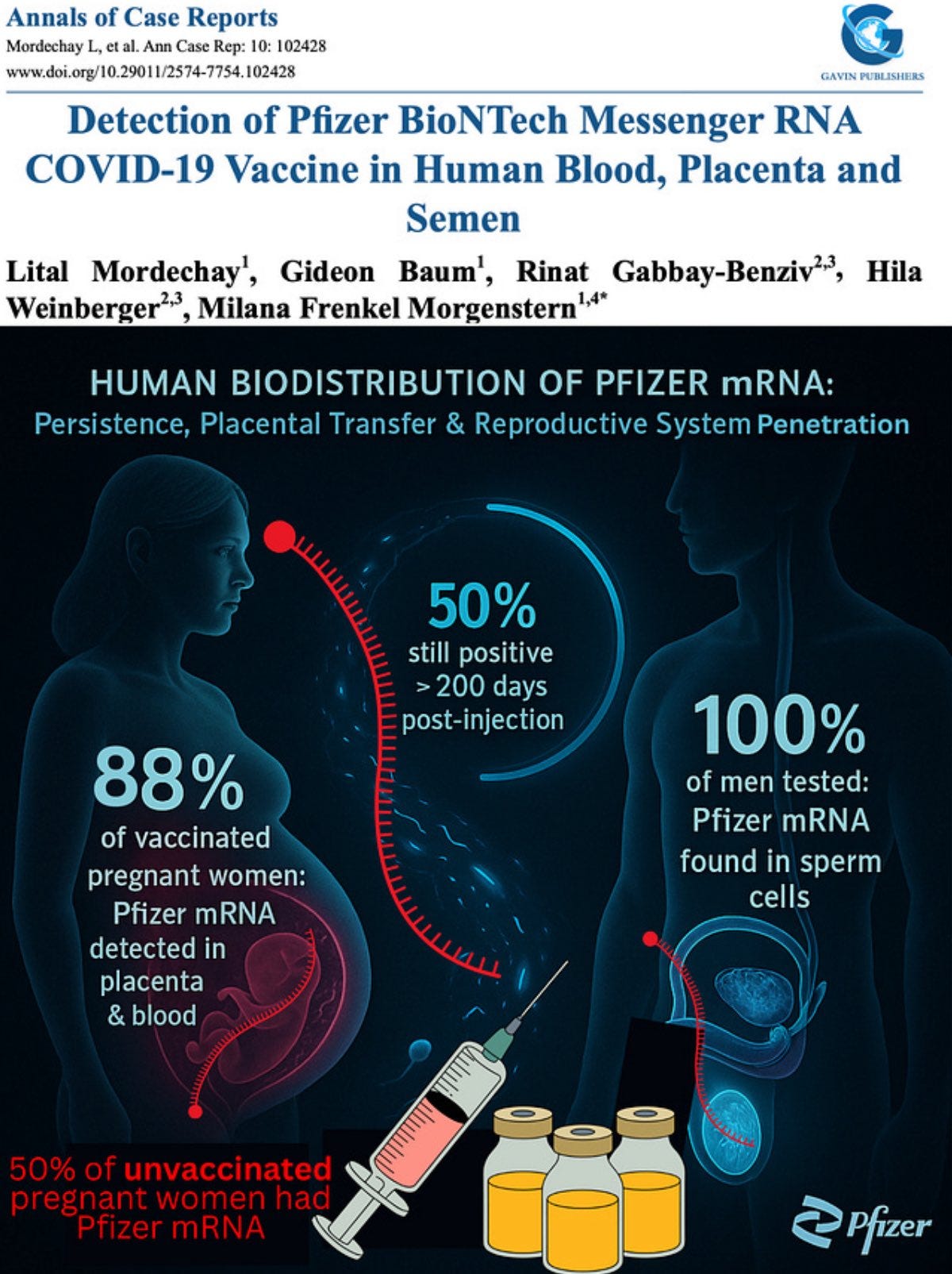Half of the unvaccinated pregnant women had Pfizer mRNA detected in their blood and/or placentas — the first direct molecular evidence of mRNA vaccine transmission (shedding).