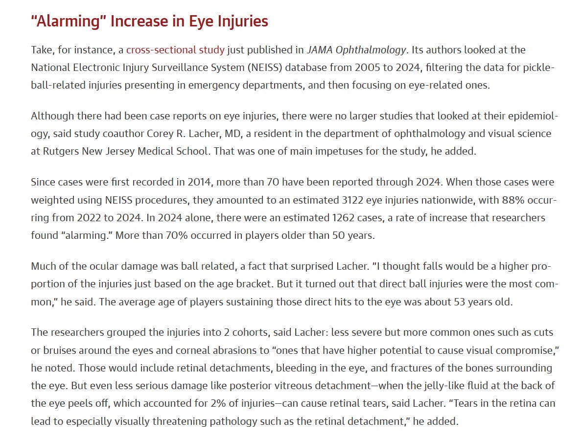 These analyses are worth considering given the gravity of some of these ocular injuries. We can expect more research in this area as pickleball continues to soar in popularity. My view as a doctor is that I welcome the sport as I see more sedentary patients getting out for some fun and getting exercise at the same time.