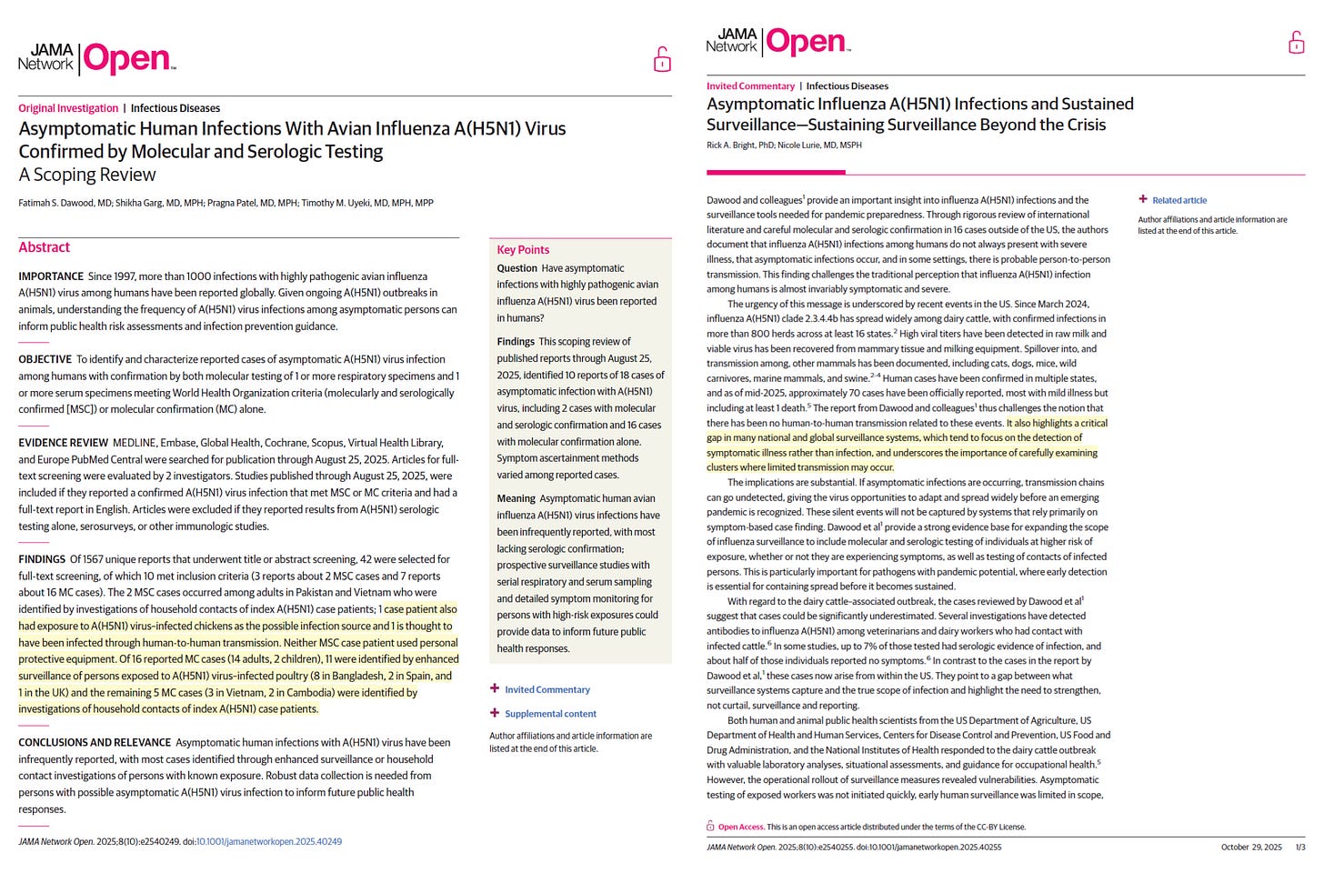 Dawood FS, Garg S, Patel P, Uyeki TM. Asymptomatic Human Infections With Avian Influenza A(H5N1) Virus Confirmed by Molecular and Serologic Testing: A Scoping Review. JAMA Netw Open. 2025;8(10):e2540249. doi:10.1001/jamanetworkopen.2025.40249