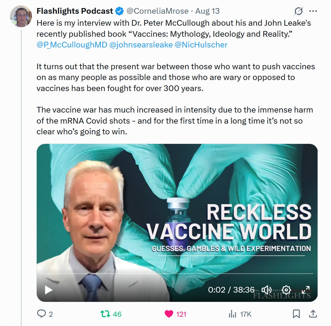 Please enjoy this issue of the Flashlights Podcast hosted by Cornelia Mrose, Associate Producer and Contractor for the Epoch Times TV show 'American Thought Leaders.' She read the book Vaccines: Mythology, Ideology, and Reality and has the quotes that you can apply in your review of immunizations, those who promote them, and how they have influenced the lives of your family members. Be sure to subscribe to the Flashlights Substack.