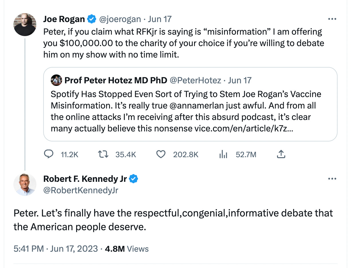 Following RFK Jr.’s appearance on Joe Rogan last week, prominent vaccine fetishist Peter Hotez made snarky comments on Twitter about the presidential candidate. Joe Rogan responded by offering to donate $100,000 to Hotez’s favorite charity if he will debate RFK, Jr. on the Joe Rogan Experience. Mr. Kennedy then tweeted a polite invitation to Dr. Hotez, inviting him to the debate: