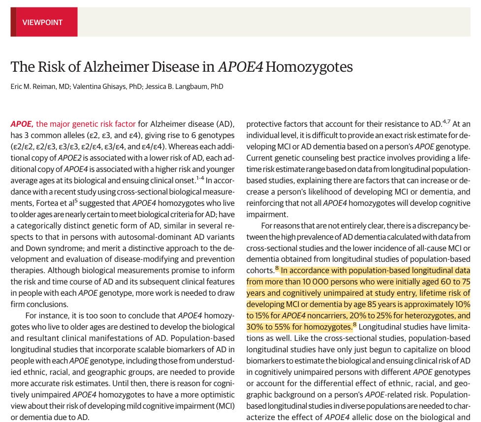 In accordance with population-based longitudinal data from more than 10 000 persons who were initially aged 60 to 75 years and cognitively unimpaired at study entry, lifetime risk of developing MCI or dementia by age 85 years is approximately 10% to 15% for APOE4 noncarriers, 20% to 25% for heterozygotes, and 30% to 55% for homozygotes (Qian et al).8