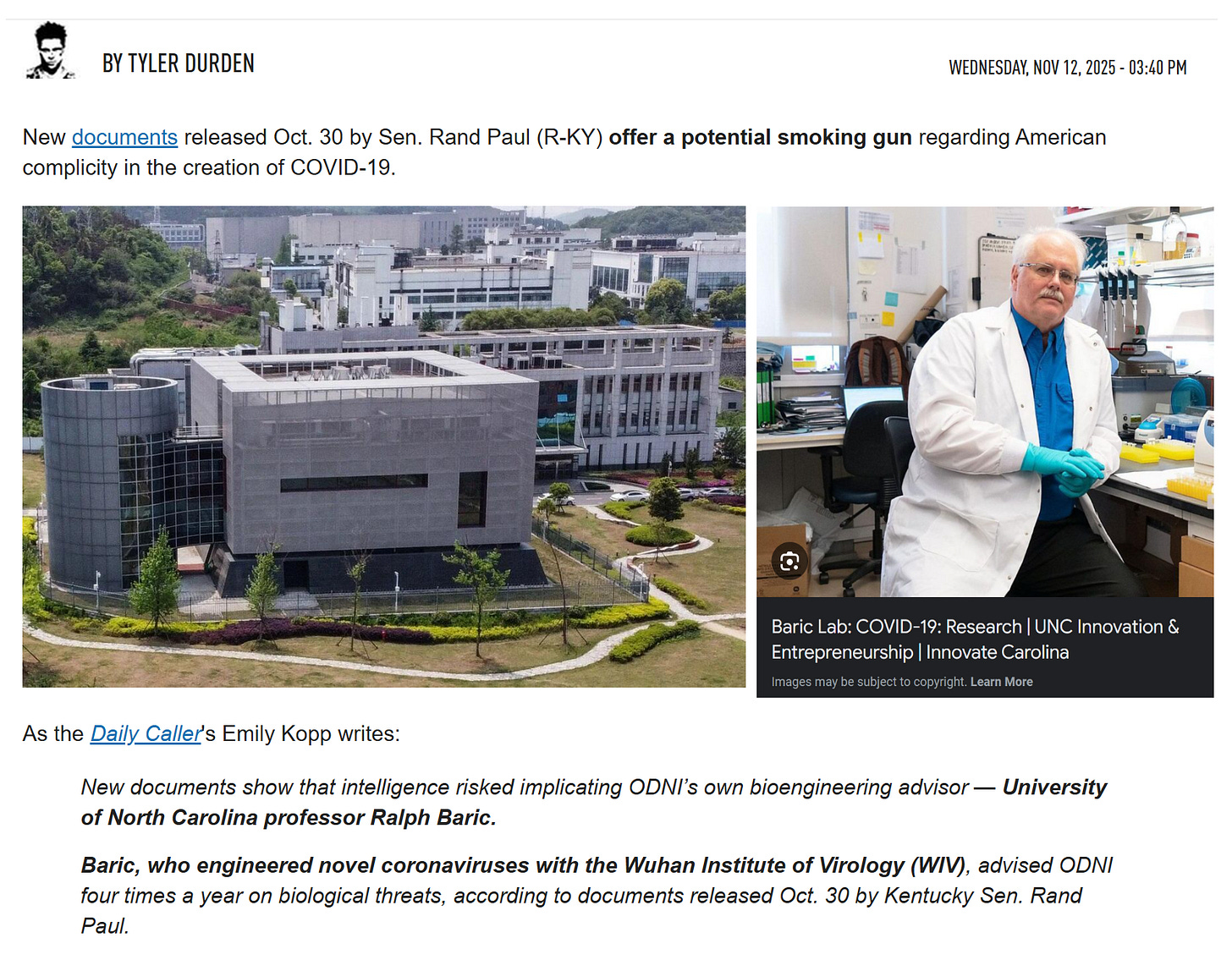 I told Emerald Robinson that Baric refused to release the genetic code of his creation which violates usual practice for federally funded research. Would the code nearly match that of the “wild-type” SARS-CoV-2? Would an investigation of Baric lead directly to the CIA, FBI, USAID, Fauci, NIAID, and the NIH Rocky Mountain Research Laboratory in Hamilton, MT? It looks like ZeroHedge and investigative authors including Jim Haslam are hot on the scent as Senator Rand Paul leads in pursuit of the truth.