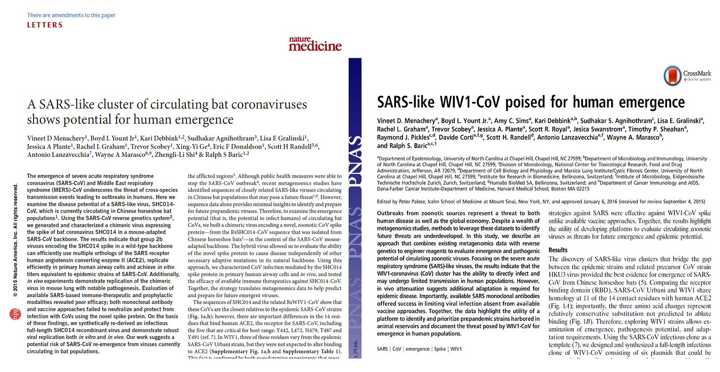 Menachery VD, Yount BL Jr, Sims AC, Debbink K, Agnihothram SS, Gralinski LE, Graham RL, Scobey T, Plante JA, Royal SR, Swanstrom J, Sheahan TP, Pickles RJ, Corti D, Randell SH, Lanzavecchia A, Marasco WA, Baric RS. SARS-like WIV1-CoV poised for human emergence. Proc Natl Acad Sci U S A. 2016 Mar 15;113(11):3048-53. doi: 10.1073/pnas.1517719113. Epub 2016 Mar 14. PMID: 26976607; PMCID: PMC4801244.