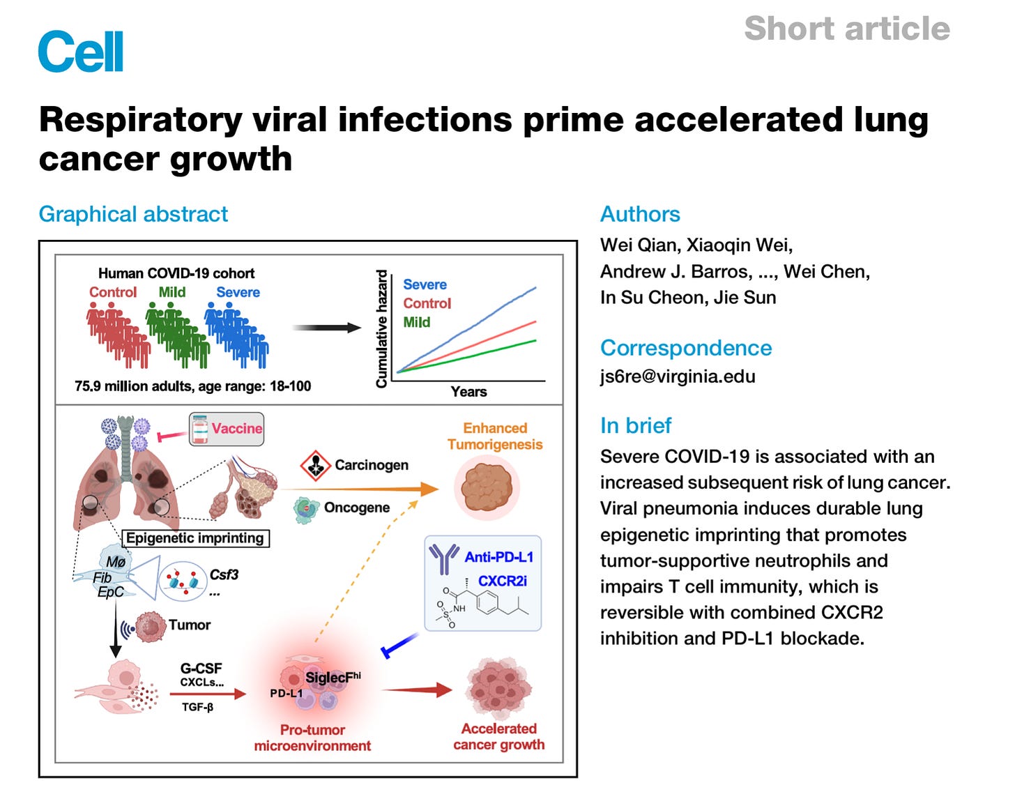 With ever-increasing evidence that the SARS-CoV-2 Spike protein is oncogenic, it stands to reason that those with severe pulmonary COVID-19 illness may have had substantial exposure and thus could be at risk for cancer. Alter AI assisted with this mechanistic paper dealing with COVID-19 pneumonia and subsequent lung cancer. The paper appeared in the March 2026 issue of Cell and was titled “Respiratory Viral Infections Prime Accelerated Lung Cancer Growth” (Qian et al., University of Virginia, et al.) The authors reveal a mechanistic framework linking severe SARS‑CoV‑2 or influenza pneumonia to later lung tumor promotion through long‑lasting immune and epigenetic remodeling of the lung microenvironment.