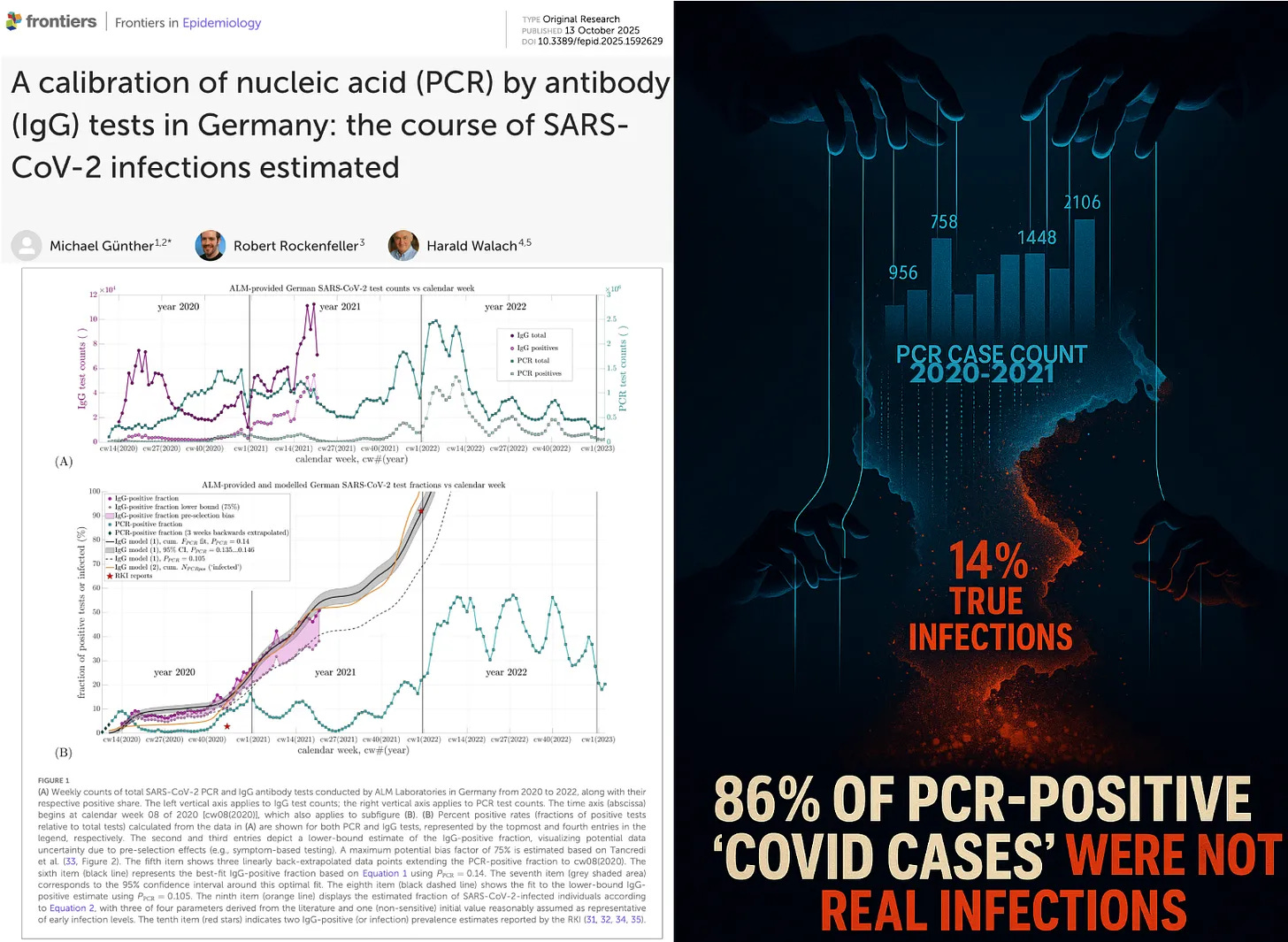 On GB News Originals with Bev Turner, I outlined the core finding of shocking new peer-reviewed study: during the early pandemic period, only about 14% of PCR-positive results represented true infections, meaning 86% were false or non-infectious detections. The study examined data from the ALM laboratory consortium, which conducted ~90% of Germany’s PCR tests, and compared week-by-week PCR positivity with IgG antibody data from the same labs.