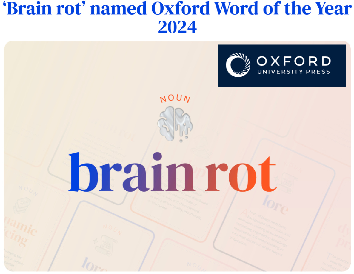 ‘Brain rot’ is defined as “the supposed deterioration of a person’s mental or intellectual state, especially viewed as the result of overconsumption of material (now particularly online content) considered to be trivial or unchallenging.”