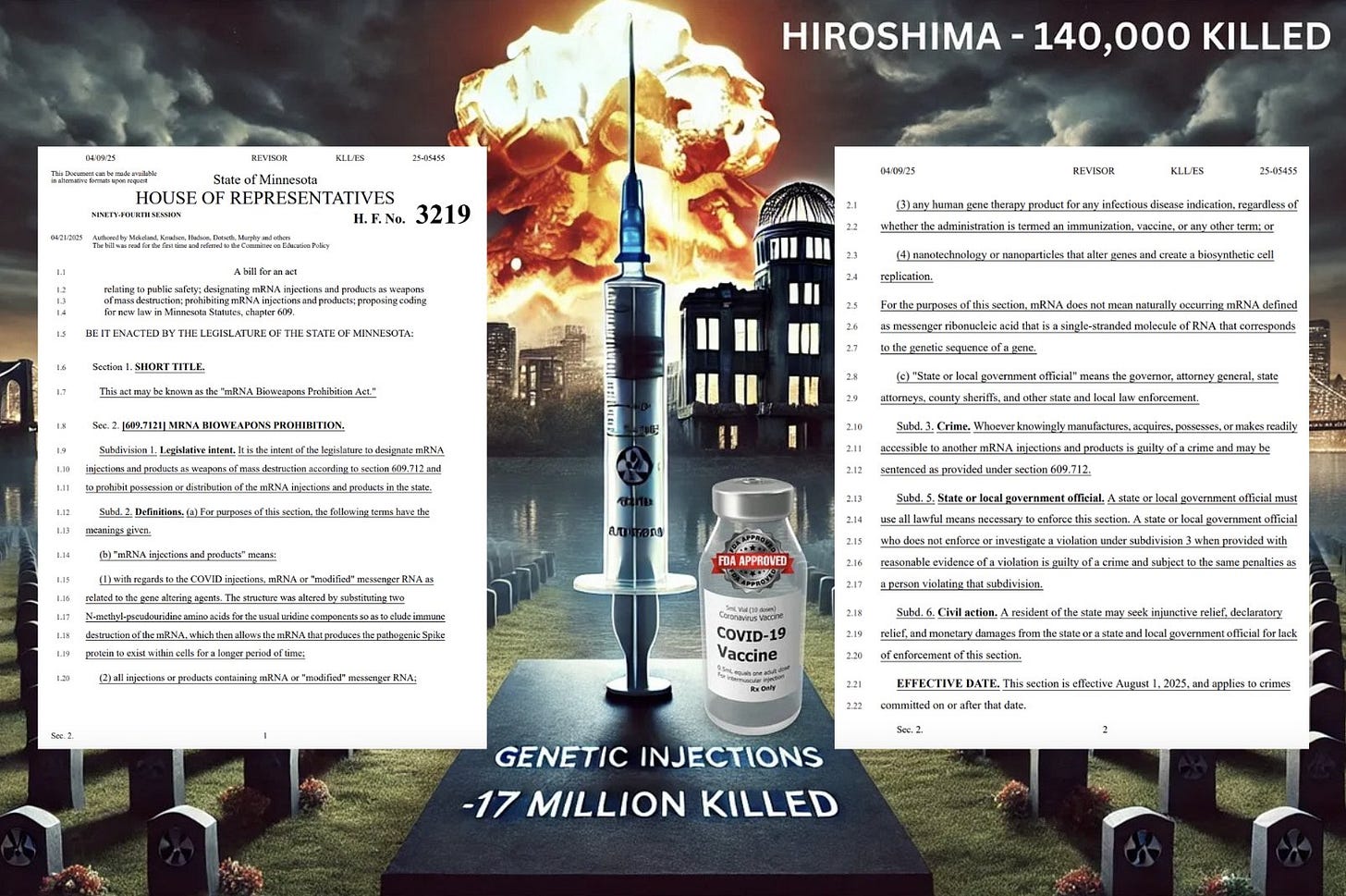STATE: Minnesota Bill HF3219 classifies mRNA injections as biological weapons of mass destruction under § 609.712 .