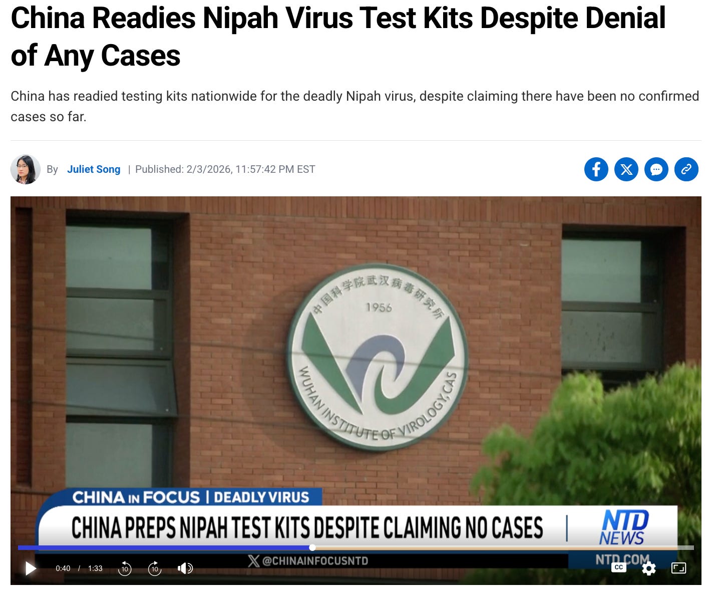 Strangely, last week NTD News reported that China is preparing Nipah virus test kits nationwide and that the Wuhan Institute of Virology announced it had identified a potential drug that could treat Nipah. It appears the infamous Wuhan Lab is currently handling Nipah virus…