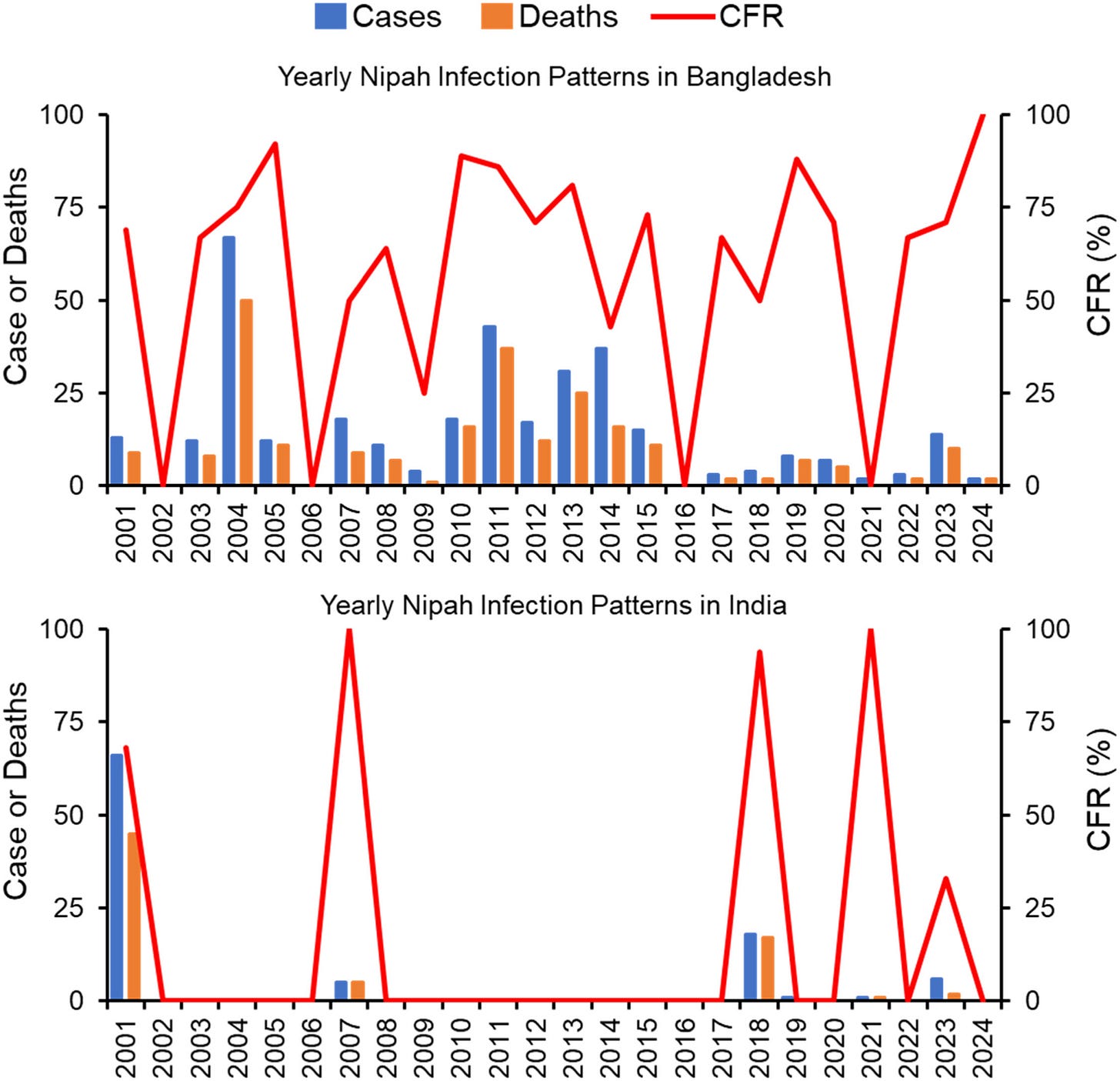 Nipah virus is a BSL-4 pathogen with case fatality rates ranging from 40–75% in documented outbreaks. Nipah virus outbreaks have occurred almost every year since the late 1990s — primarily in Bangladesh and India.