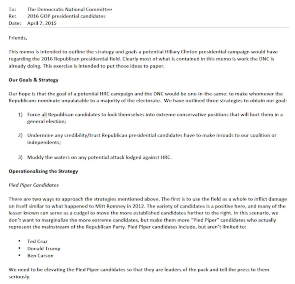 On April 23, 2015, two weeks after Hillary Clinton officially declared her presidential campaign, her staff sent out a group message with information for a "strategy call." The email included as an attachment a "memo for the DNC discussion.