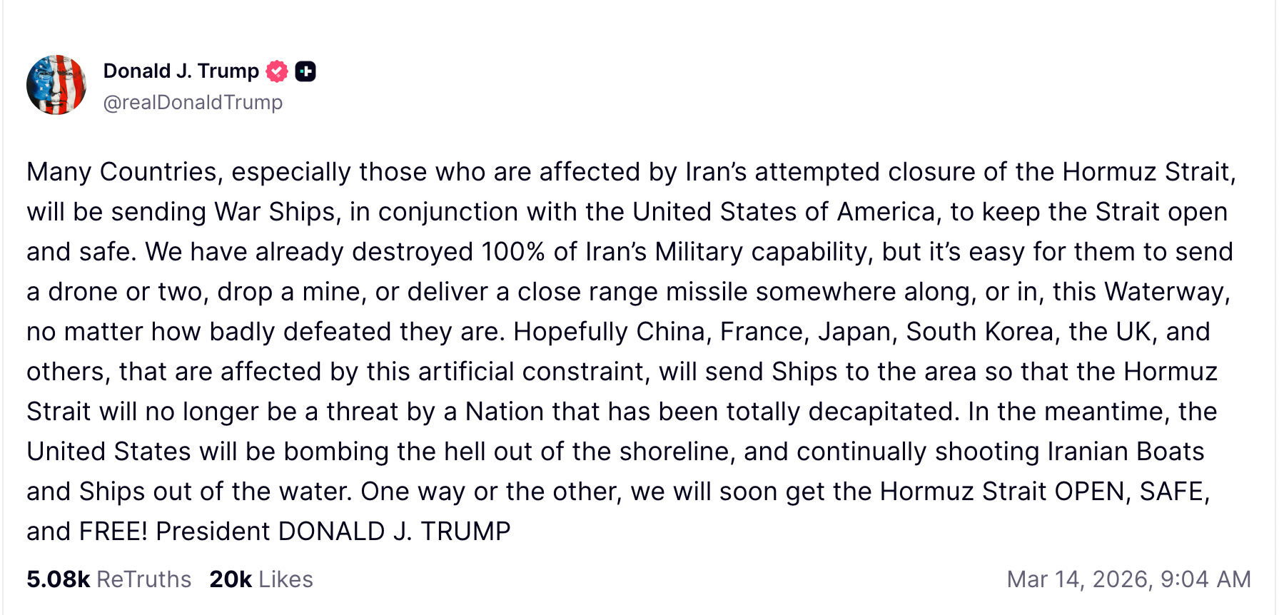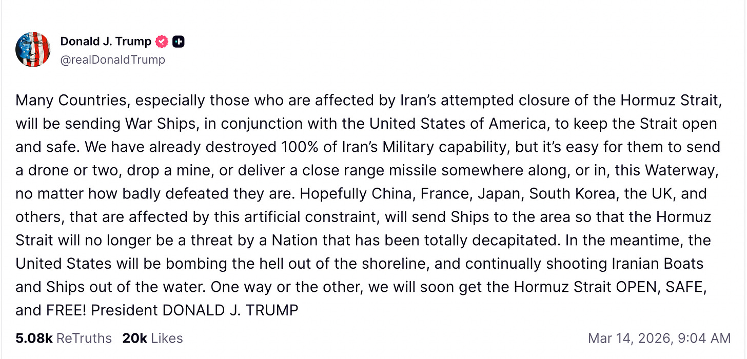 Trump writes of the “attempted closure” and the need to “keep the Strait open and safe” as though the Straight is not, in fact, closed.