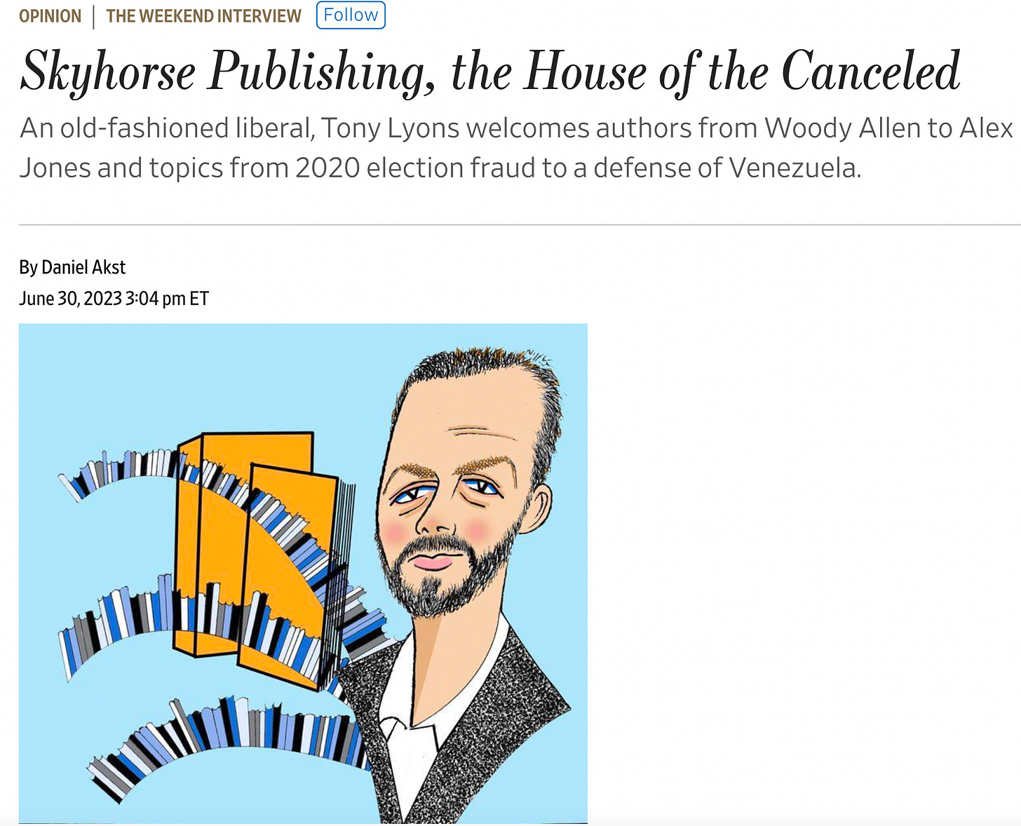 A few days ago I was delighted and encouraged to see a thorough feature on Tony and Skyhorse in the Wall Street Journal. I hope all of our Subscribers will take the time to read it and share it with friends. Tony is doing a heroic job of defending our tradition of free speech, free thought, and publishing truly diverse voices.