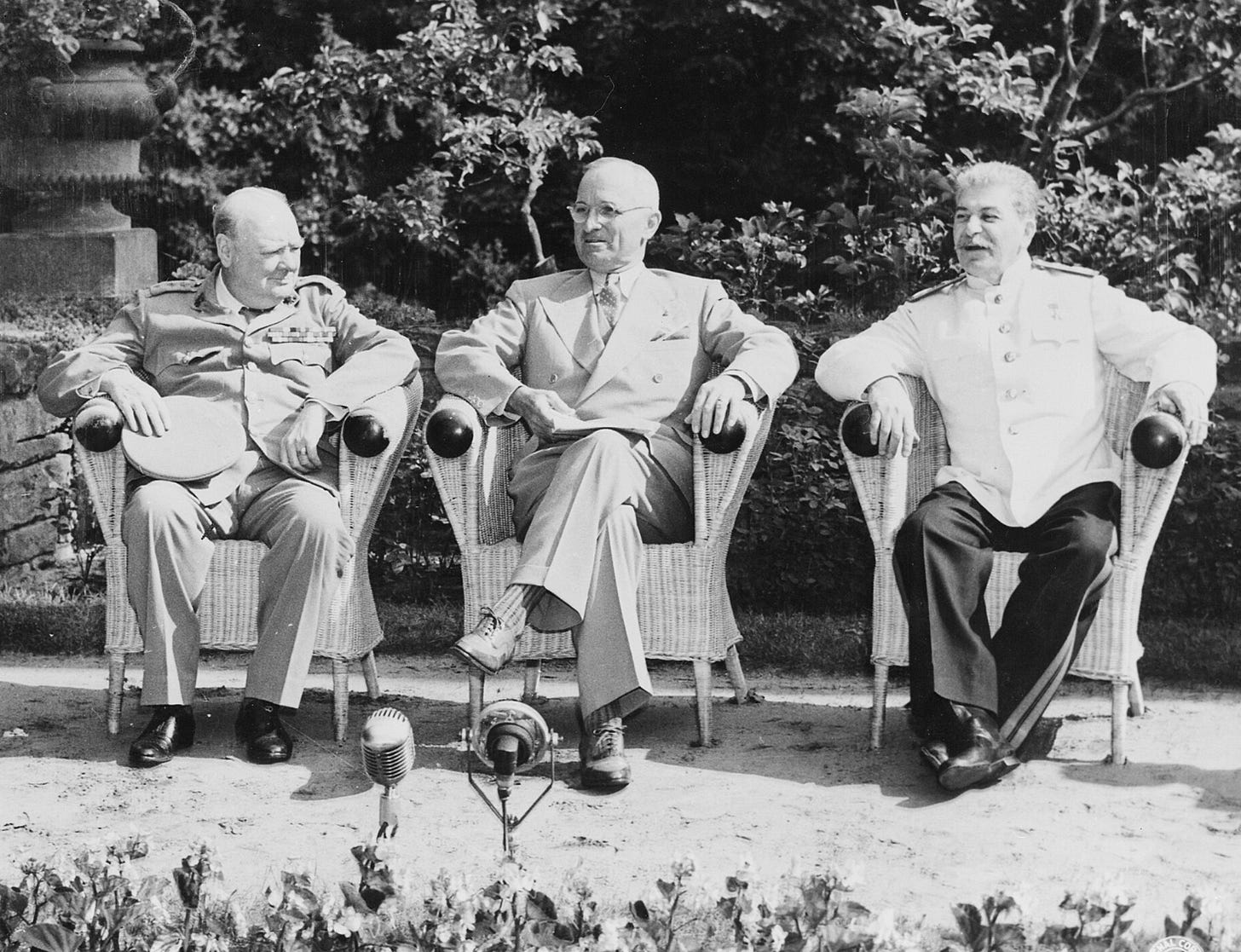 Here’s Truman meeting Stalin at the Potsdam Conference on July 17, 1945, at which he told Stalin that the U.S. was in possession “of a new weapon of unusual destructive force.” Stalin showed no reaction to this announcement. This was easy enough for him to do, given that he already knew about the U.S. atomic bomb program from his spies.