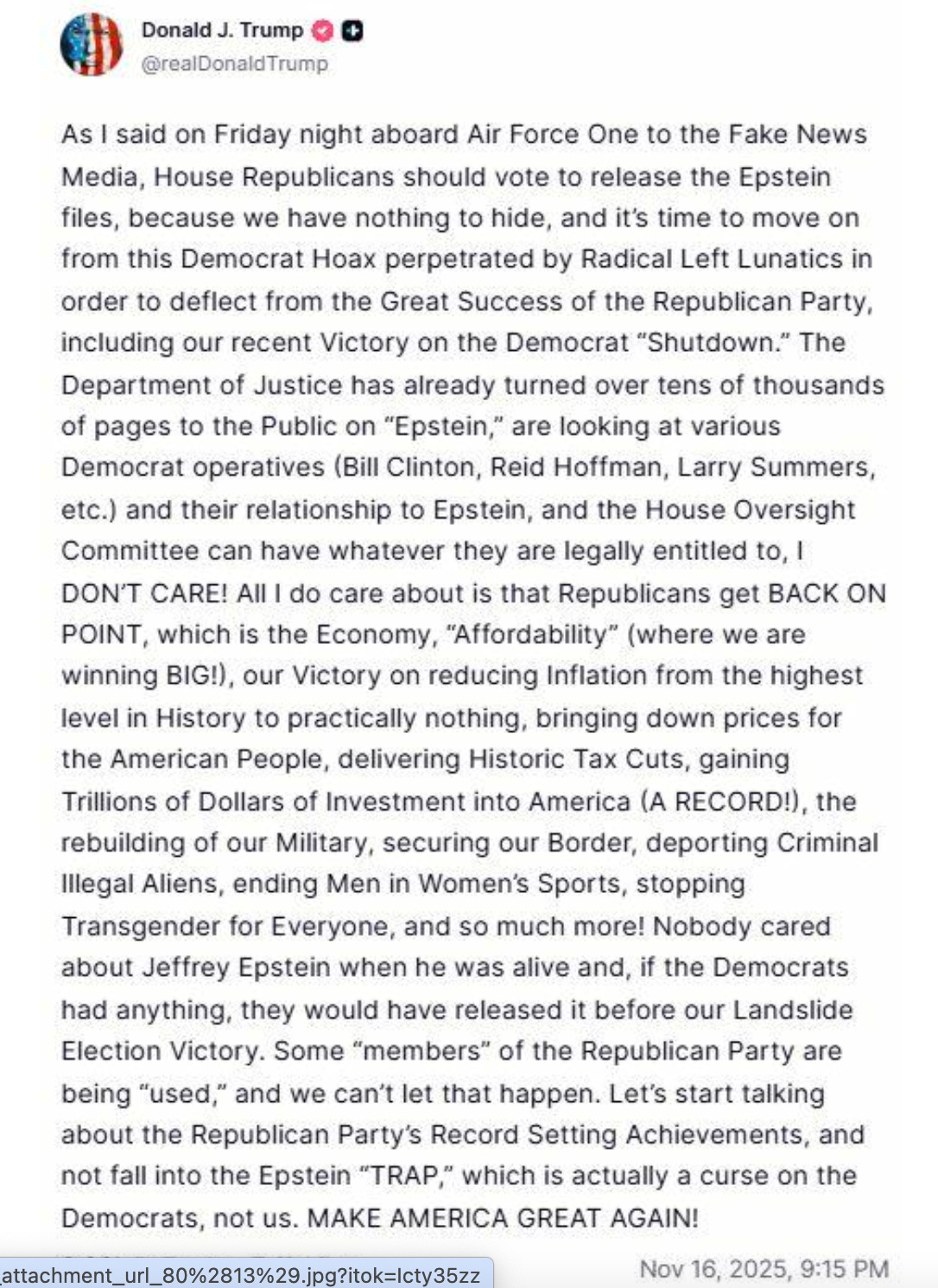 Last night President Trump stated on his Truth Social account that he is reversing course in the matter of the Epstein files and now supports their full release.