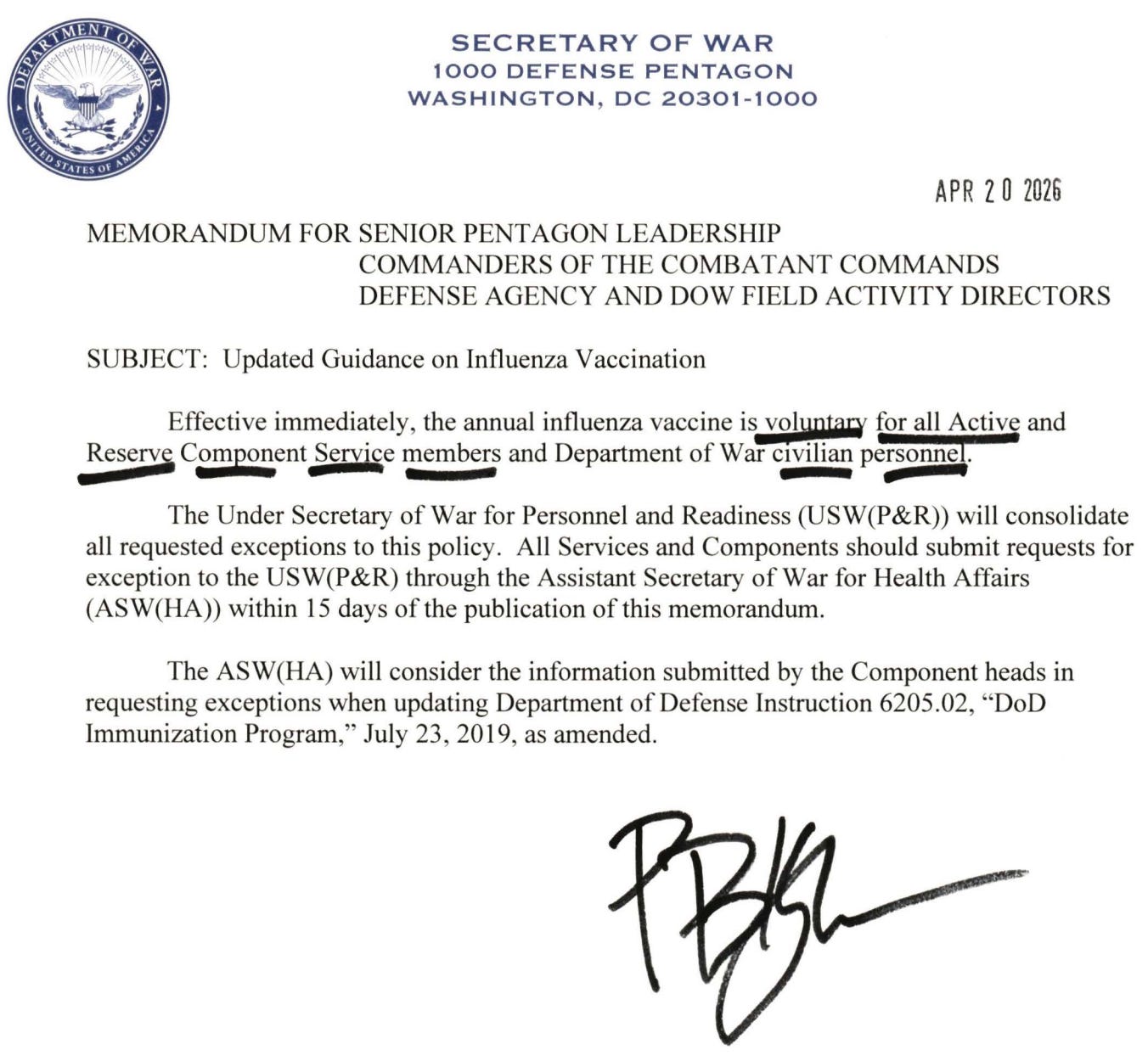 On April 20, 2026, the Secretary of War issued a memorandum declaring the annual influenza vaccine is now voluntary for all Active and Reserve Component Service members and Department of War civilian personnel, effective immediately.