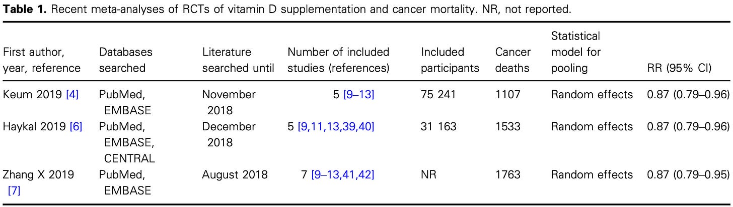 Over 900 studies show anti-cancer activity of vitamin D across most cancer types, and randomized controlled trials demonstrate a ~13% reduction in cancer mortality.