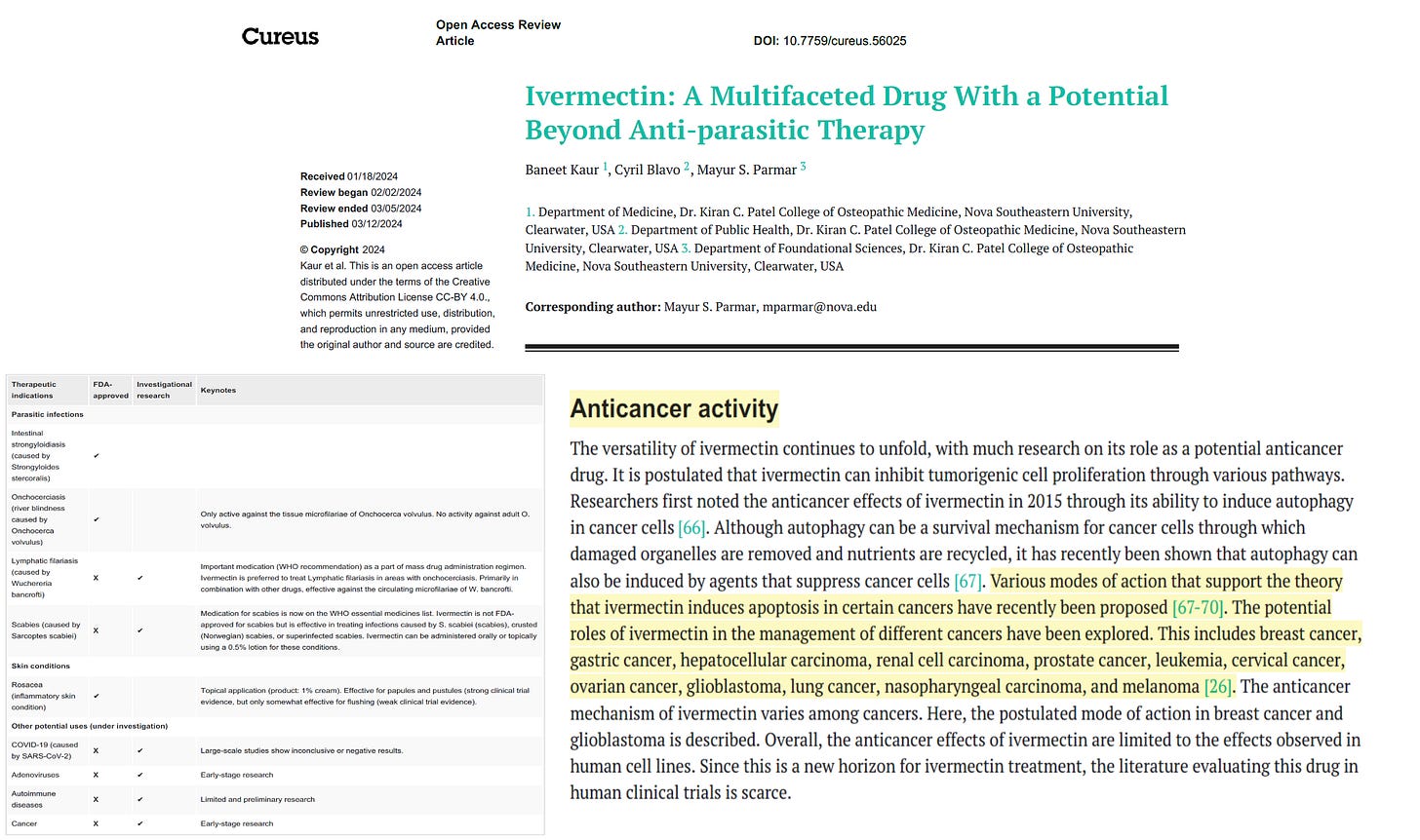 Kaur et al. published this review demonstrating academic interest in a wide range of cancers. I opined to her that the National Cancer Institute should support large randomized trials to test ivermectin.