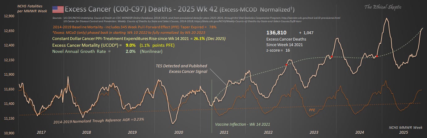 CDC data shows over 136,000 excess cancer deaths in the U.S. since mass vaccination began in 2021.