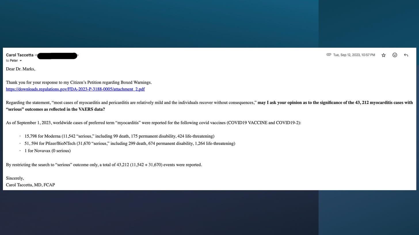Dr. Taccetta has spent countless hours trying to make a difference—submitting petitions, engaging the process, and writing directly to Dr. Peter Marks—all in an effort to fully inform the public about the risk of fatal heart damage.